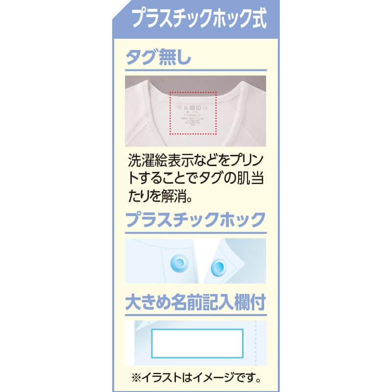 備考…タグ無し、縫目が外側で肌当たりが良い、大きめ名前記入欄付、後ろ身頃長め、動きやすいラグラン袖半袖、抗菌防臭、